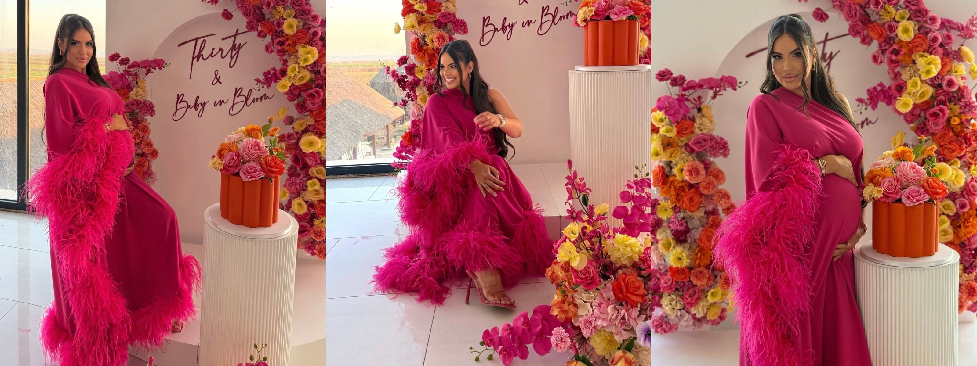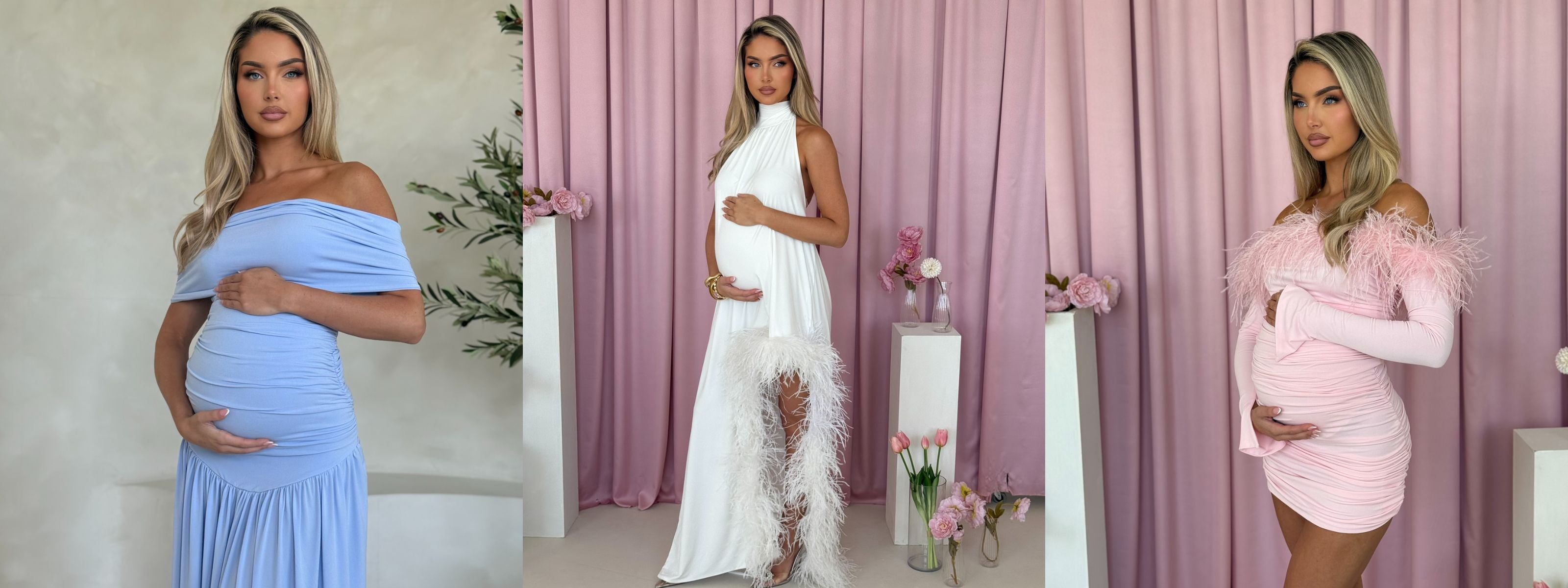 Off the shoulder feather maternity maxi dress
