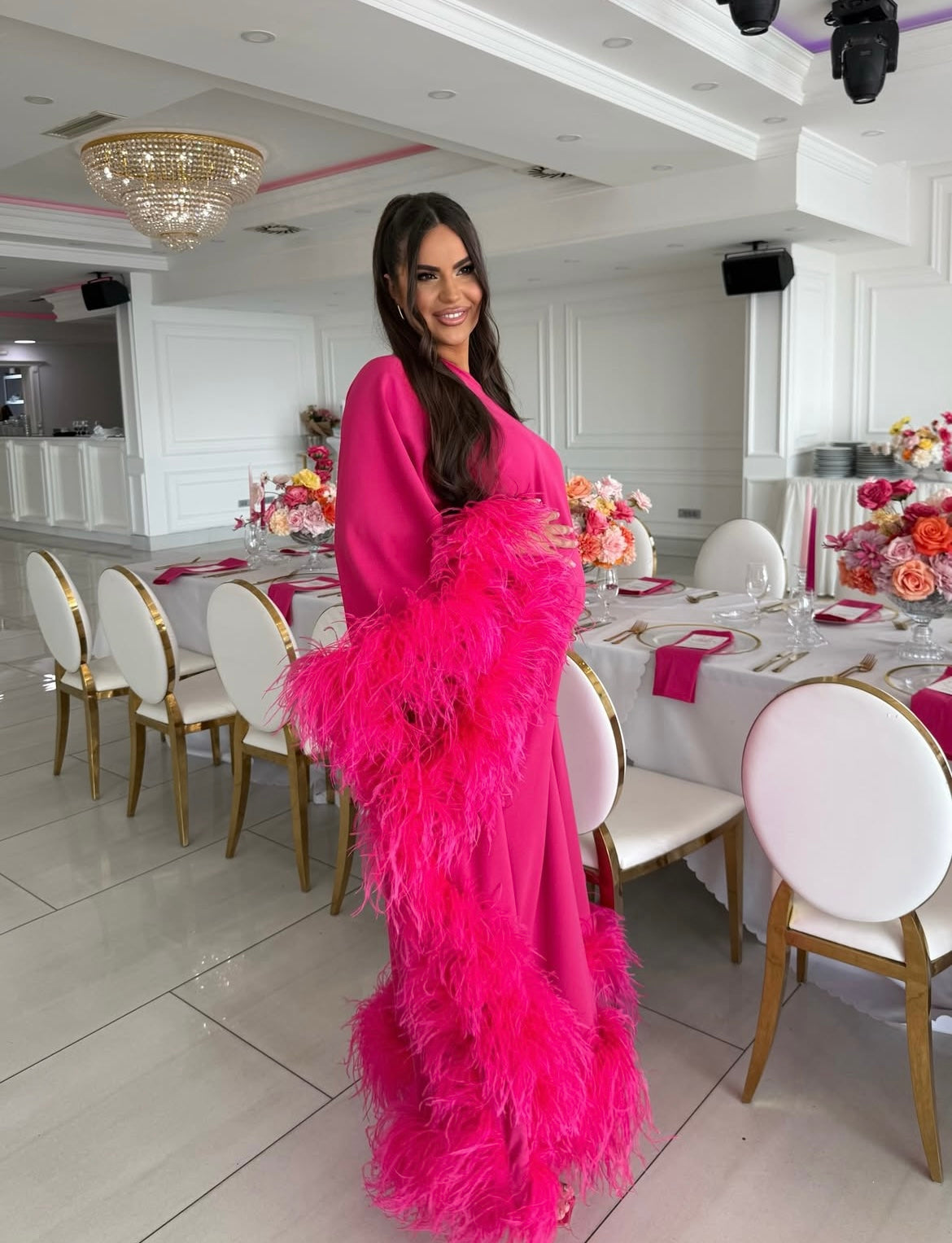 Ostrich Feather one sleeve maternity floorlength dress with side split
